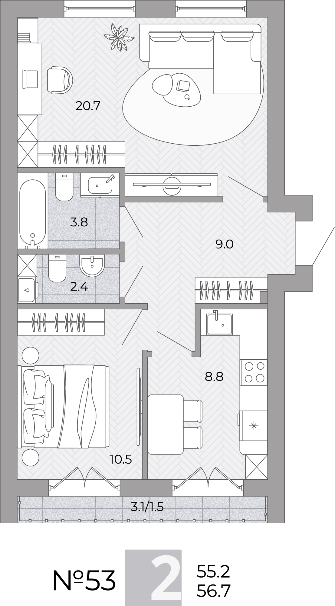 - Общая площадь - 56.70м²
