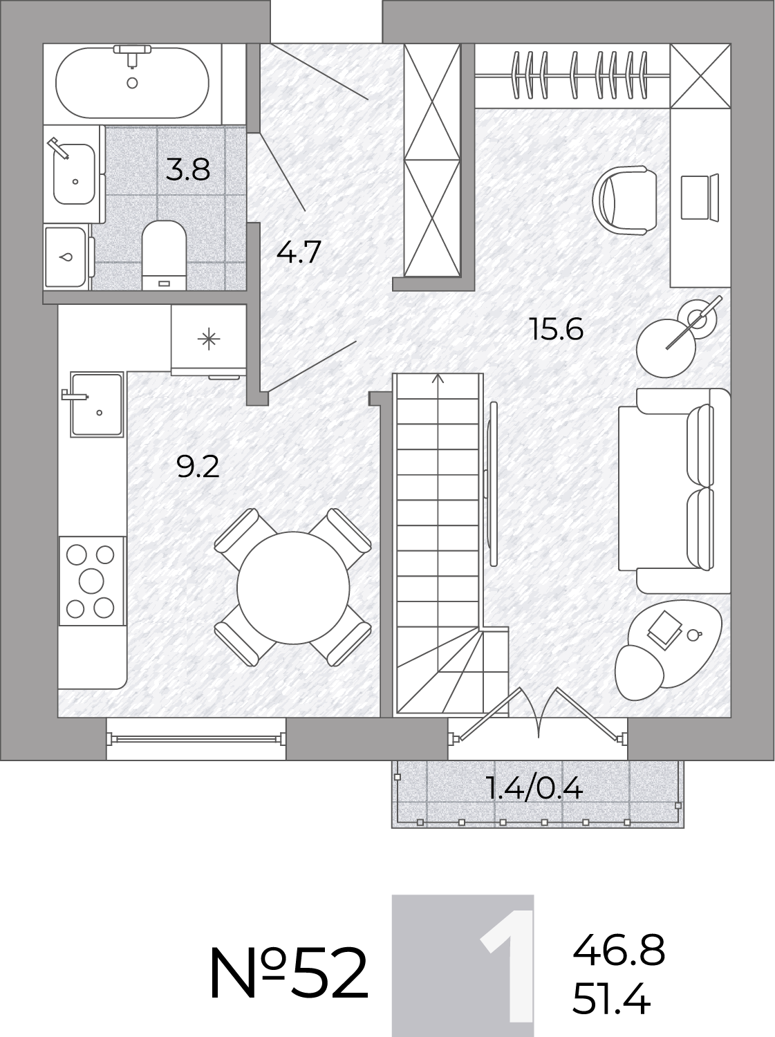 - Общая площадь - 51.40м²